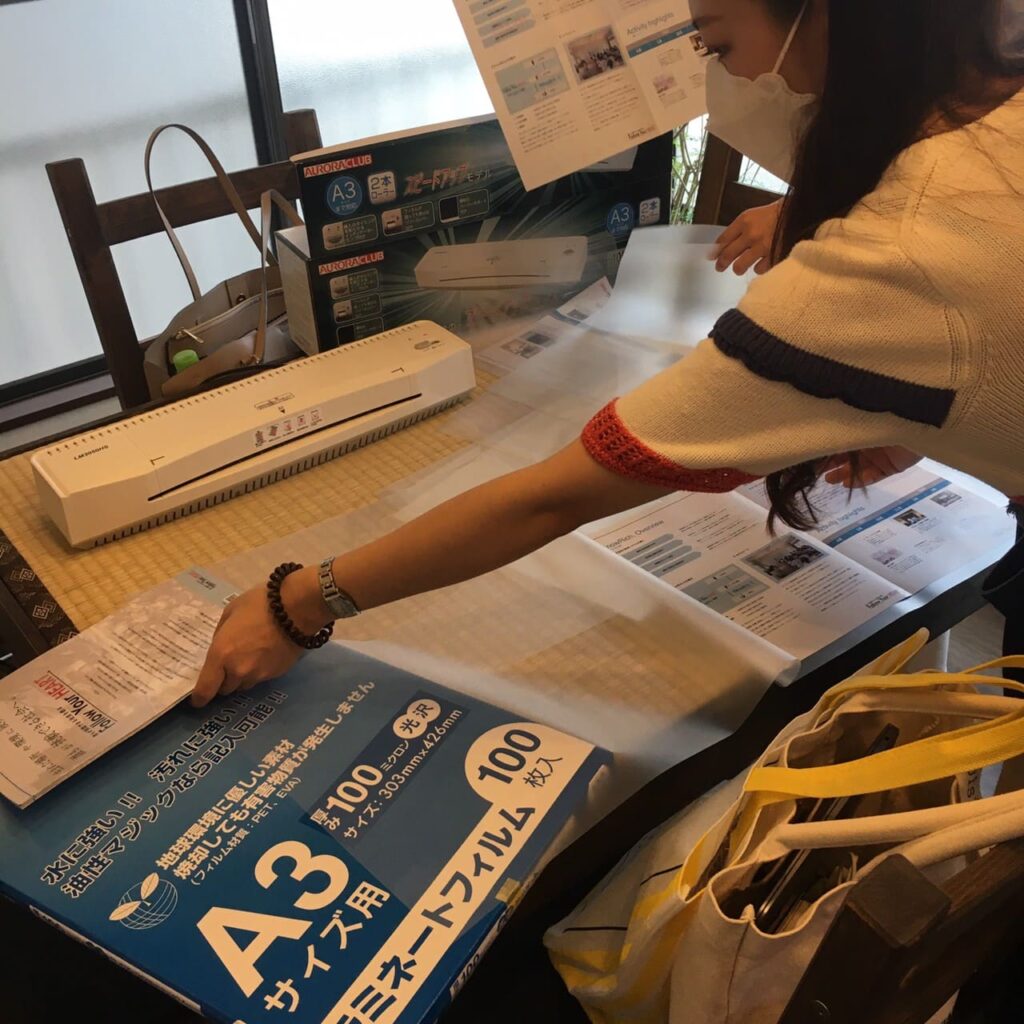 当日は募金箱にテプラで工夫したり、活動情報満載のパンフレットを一緒にパウチしたり